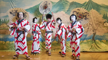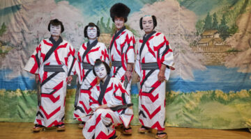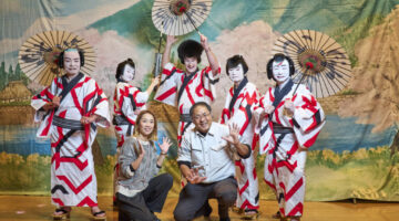 After putting on wigs, holding umbrellas, and wearing geta sandals, let’s make a dramatic Kabuki pose under the instruction of Shimojo Kabuki actors.